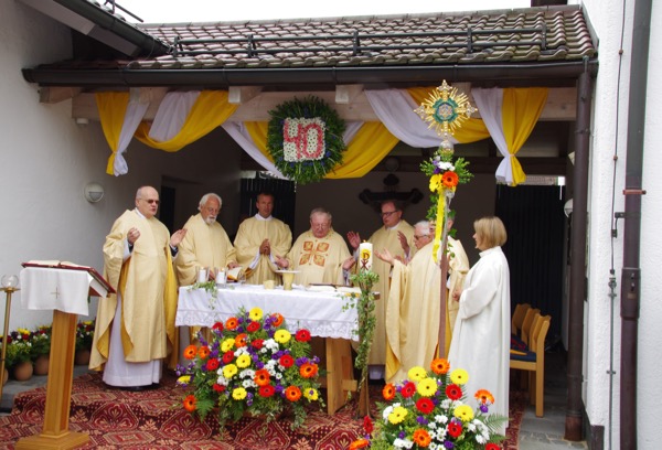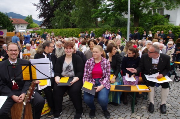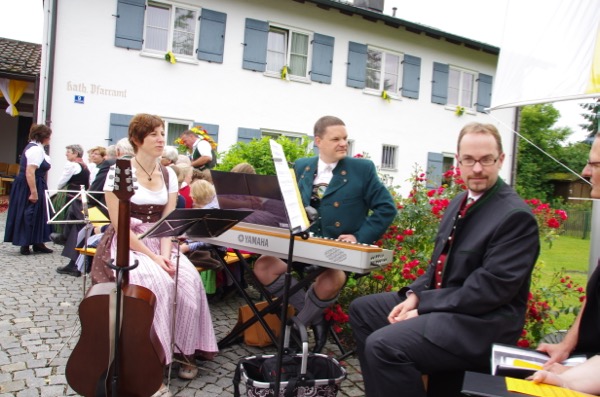 Fleißige Helfer hatten vor dem Pfarrhof einen Freialtar mit prächtigem Blumenschmuck aufgebaut. Die Ortsvereine kamen mit ihren Fahnenabordnungen und die Gottesdienstbesucher strömten in Scharen herbei, unter ihnen sehr viele Kinder und junge Leute. Nach dem Einzug hieß der Pfarrgemeinderatsvorsitzender Alois Aigner die Besucher und in erster Linie den Jubilar willkommen. Aigner brachte mit herzlichen Worten hohe Wertschätzung dem Priester gegenüber zum Ausdruck. Pfarrer Koller freute sich über die Anwesenheit zahlreicher Pfarrangehöriger, den Mitgliedern von Kirchenverwaltung und Pfarrgemeinderat, den Vertretern der politischen Gemeinden Piding und Anger, der Delegation aus seiner Heimatpfarrei Altenerding, seiner Familie, den Mitarbeitern und Konzelebranten. „40 Jahre Priester zu sein, ist eine Zeit des Suchens und Ringens, eine Zeit des Gelingens, aber auch eine Zeit des Versagens“ äußerte sich der Jubilar sehr offen und legte dar: „Man ist nicht fertig, wenn man als Priester geweiht ist, denn oftmals taucht die Überlegung auf ob auch alles so rüberkommt, wie man es sagen möchte.“ Pfarrer Josef Koller war in den letzten Monaten gesundheitlich sehr stark angeschlagen, dennoch war es ihm möglich, zu seinem Priesterjubiläum die Messe zu zelebrieren und auch die Predigt zu halten. Es war wieder eine jener Predigten, die von den Gläubigen so geschätzt werden. Denn sie sind verständlich und nachhaltig. Pfarrer Koller legte bei der Predigt zur Festmesse seinen Fokus auf die Erfahrungswerte. „Wissen alleinreicht nicht aus, wenn nicht auch die Erfahrung dazukommt“. Er stellte heraus, dass das Fach Theologie jeder studieren könne, der das Abitur hat und man Grundsätzliches in einem Lexikon nachlesen könne. „Aber es muss noch dazukommen, dass man spürt, dass da noch einer über mir ist“, sagte Pfarrer Koller. „Die Bibel ist kein Rezeptbuch, kein Lexikon und kein Kodex für kirchliche Normen, die Heilige Schrift ist ein Erfahrungsbuch, in dem die Erfahrungen mit Gott niedergeschrieben sind“, so der Jubilar. Weiter machte er seine Dankbarkeit darüber deutlich, dass er 40 Jahre lange „nicht auf dem verkehrten Dampfer“ war. Das Leben an sich bezeichnete er als „Fahrt auf dem Meer der Zeit“ bei dem es auch verschiedenste Stürme zu überstehen gilt. Dankbar zeigte sich Pfarrer Koller dafür, dass es ihm seit 40 Jahren möglich ist, die Botschaft von Gott zu vermitteln und schloss mit dem Satz: „Wir sind nicht die Herren eures Glaubens sondern die Diener eurer Freude.“ Mit festlichen Gesangs- und Musikbeiträgen gestaltete sich der weitere Verlauf der Messe. Der Kirchenchor, der Chor „Junge Musik“, der Kinderchor und das Bläserduo Kamml/Horn waren abwechselnd für den musikalischen Rahmen zuständig. Am Ende des Gottesdienstes gab es viele herzliche Worte für Pfarrer Josef Koller, der seit 15 Jahren Seelsorger in Piding ist. Es waren aber nicht nur Dankesworte sondern auch viele gute Wünsche für eine baldige vollständige Genesung von seiner schweren Krankheit. Für die Ministranten übergab Thomas Kruck ein Präsent und brachte es mit einem kurzen Satz auf den Punkt: „Wir hatten in letzter Zeit viele Aushilfen hier in Piding, aber Sie sind der Beste.“ Dekan Dr. Thomas Frauenlob würdigte mit freundschaftlichen Worten im Namen der Dekanatskonferenz Berchtesgaden die Arbeit von Josef Koller und hob hervor, wie wichtig eine gute Arbeit an der Basis ist. Bürgermeister Hannes Holzner überbrachte Glückwünsche auch im Namen seines Amtskollegen aus Anger und dem Bürgermeister aus Ruhpolding Claus Pichler, der ebenfalls gekommen war. „Heute können wir Ihnen einen kleinen Teil unserer Wertschätzung wiedergeben, denn Sie haben uns in den 15 Jahren Ihres Wirkens viel nahe gebracht. Das zeigt vor allem auch die Anwesenheit der vielen Kinder und Jugendlichen,“ sagte Holzner. Zu den Gratulanten zählte auch eine Delegation des Pfarrkindergartens unter Leitung von Karin Brüderl. Ein sehr persönliches und anrührendes Lied zum Jubiläum und einen Trachtentanz hatten die Erzieherinnen mit den Kindern vorbereitet. In die Reihe der Gratulanten gliederten sich auch ein Vertreter der Kolpingfamilie Bad Reichenhall, Pater Franz aus Salzburg und Anni Utz mit ein. Pfarrer Koller selbst war es ein Anliegen, sich für die persönlichen Genesungswünsche zu bedanken, die ihm während seiner Krankheit entgegengebracht wurden. Deshalb hatte er auch Präsente vorbereitet, für jene Personen, die ihn besonders unterstützt haben. Christa Bauer, Christine Koch, Maria Brüderl und Anni Utz wurden vom Jubilar mit einem Geschenk bedacht. Präsente gab es auch für die drei Damen vom Pfarrhof: Anni Haiker, Ingrid Schröpfer und Ulli Traxl. Eine besondere Freude war es für Pfarrer Koller, dass auch Familienmitglieder nach Piding gekommen waren, für sie hatte er ebenfalls Präsente parat. Nach dem festlichen Gottesdienst wurde dann beim Pfarrfest fröhlich weiter gefeiert, dabei sorgte die Musikkapelle Piding für die Unterhaltung der Gäste.