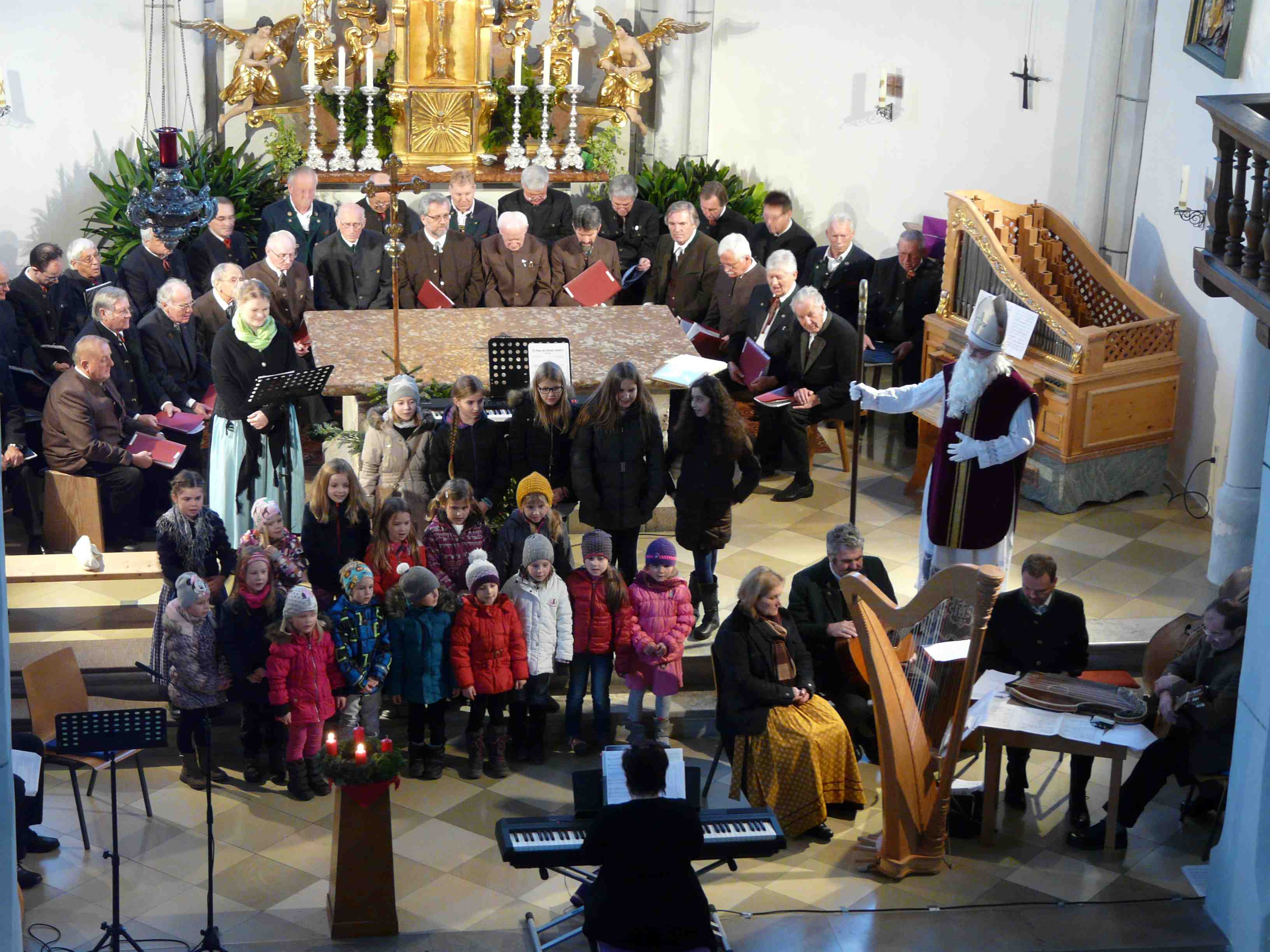 Der Altarraum war gut gefüllt mit den Mitwirkenden des Angerer Adventsingen, dass einer langen Tradition zufolge wiederum vom „Männerchor Frohsinn“ veranstaltet wurde. Diesmal bekamen die Männer aus Anger noch stimmliche Unterstützung von den Sangeskollegen aus Siegsdorf. Die Chöre trugen entweder einzeln oder gemeinsam zur Programmgestaltung bei und einmal mehr zeigte sich, dass volle warme Männerstimmen wie geschaffen sind, um die Botschaft der Weihnachtszeit zu transportieren. Als separate Gesangsgruppen waren an diesem Nachmittag „gute Bekannte“ beim Angerer Adventsingen zu hören. Die Höglwörther Sänger und die Vogelauer Sänger ließen wieder ihre schönen Klangharmonien hören. Beiträge aus dem alpenländischen Raum in bayerischer Mundart gesungen, verliehen der Veranstaltung ein regionales Kolorit. Dieses wurde durch die Stücke der Stubnmusi noch vertieft. Mit zwei Gitarren, Harfe, Zither und Kontrabass spielten die Instrumentalisten auf, und heuer gab es dabei eine Besonderheit. Die Organisatorin des Adventsingens, Martina Jakob spielte mit den Saitenmusikanten zusammen an der Orgel. Diese Orgel steht seit mehreren Jahren im Angerer Altarraum und kam heuer zu besonderen Ehren. Hans Höglauer aus Aining, der Vater der Harfenistin aus der Stubenmusi, hat sie damals gebaut und der Pfarrei Anger gestiftet. Ein besonderes Klangbild, das an den großen Salzburger Volksmusikanten Tobi Reiser erinnert, entwickelte sich bei den Programmstücken, wenn Stubenmusi und Orgel gemeinsam zu hören waren. Für einen Hauch jugendlichen Elan sorgten die Kinderchöre des Pfarrverbandes, ebenso wie der Männerchor Frohsinn geleitet von Martina Jakob. Mit erfrischenden Stimmen boten die Mädchen des Kinderchores ihr Repertoire dar, ganz besonders als der „Heilige Nikolaus“ in Erscheinung trat. Am Gedenktag dieses bekannten Heiligen, an dem das Adventsingen statt fand, war sein Auftritt bestens gelungen. Der hohe Überraschungsgast bedankte sich bei den Mitwirkenden für ihren Einsatz und bei den Zuhörern für ihren Besuch. „Ihr leistet damit einen Beitrag, um unser christliches Dorfleben zu bereichern“ lobte der heilige Mann. Nachdem die Kinder ein Lied vorgetragen hatten, wurden sie mit kleinen Gaben belohnt. Nach dieser Einlage ging es klanglich weiter durch den Advent in Richtung Bethlehem. Wobei die einzelnen Gruppen viel Gefühl für Vortrag und Thematik an den Tag legten und so die Zuhörer förmlich behutsam an die Hand nahmen. Das akustische Gesamtbild wurde ergänzt durch Sopranistin Katharina Tschakert und das Bläserduo Christian Häusl und Matthias Gschwendtner von der Bergschützenkapelle Anger. So entwickelte sich eine abwechslungsreiche Gesamtzusammenstellung, die die über 2000 Jahre alte Geschichte in hervorragender Weise in die Gegenwart transportierte und im Höhepunkt der Verkündung der Geburt des Erlösers gipfelte. Zum ersten Mal wirkte heuer Ulli Traxl als Sprecherin mit. Sie trug mit wohldosierten kurzen Textpassagen zur Abrundung der Veranstaltung bei. Sie thematisierte in ihren Betrachtungen unter anderem den Advent an sich, den Adventskranz, die Gottesmutter Maria und die Hirten. Sehr nachdenklich waren ihre Betrachtungen zum Thema Herbergssuche, das heute aktueller denn je ist. „Derzeit gibt es weltweit 31 Kriege, 51 Millionen Menschen sind auf der Flucht, davon 10 Millionen aus dem nahen und mittleren Osten. Als Christen sind wir aufgerufen zu handeln und sollten nicht vergessen, dass Christus in jedem von uns lebt“.