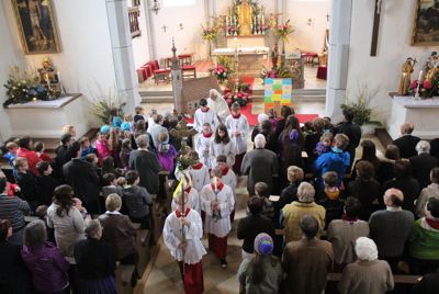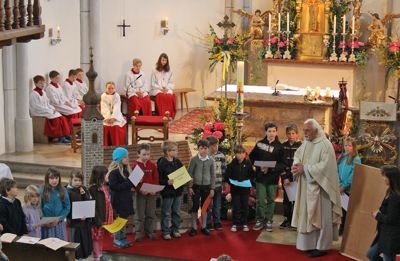 Musikalisch festlich gestaltet wurde die Messe in der von Mesnerin Irmi Fagerer liebevoll geschmückten Kirche von Martina Jakob an der Orgel. Gemeinsam oder im Wechsel mit Jakob sang das Volk als Einstimmung auf die Erstkommunion nächsten Sonntag Lieder vom Erstkommunion-Liedblatt. Viel Leben in die Kirche brachte das Danklied „Du lädst uns ein“, bei dem die Kinder mit großer Freude rhythmisch mitklatschten.