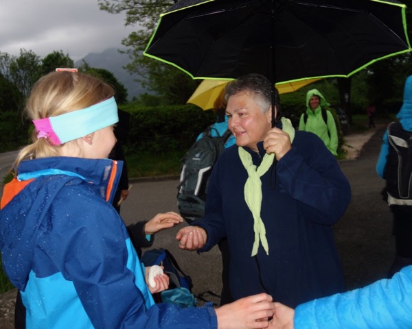 Nicht zu enden scheint die Etappe durch die Saalachauen, bis wir endlich im Marienheim des BRK ankommen. Dort servieren die Helfer der Rotkreuz-Bereitschaft, die die Wallfahrt von Anbeginn begleiteten, heuer mit acht Helfern, zum ersten Mal warmen Zitronentee. Wie viele von uns genießt Catalina (16), eine Austauschschülerin aus Kolumbien, das Sitzen, während sie sich die Brotzeit ihrer Angerer Gastfamilie schmecken lässt. Sie ist beeindruckt von der Wallfahrt: „Es ist sehr schön, der Ausblick, die Leute....“ Da sie in der lauten Hauptstadt Bogotá lebt, saugt sie die ländliche Ruhe so richtig auf. Und sie hat schon ihr bayerisches Lieblingsgericht gefunden: Bosna.