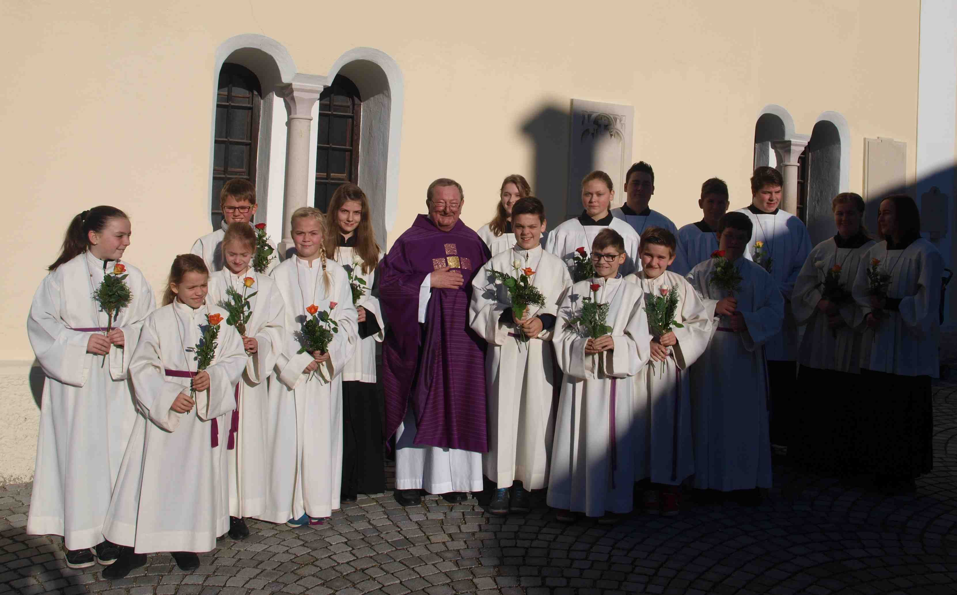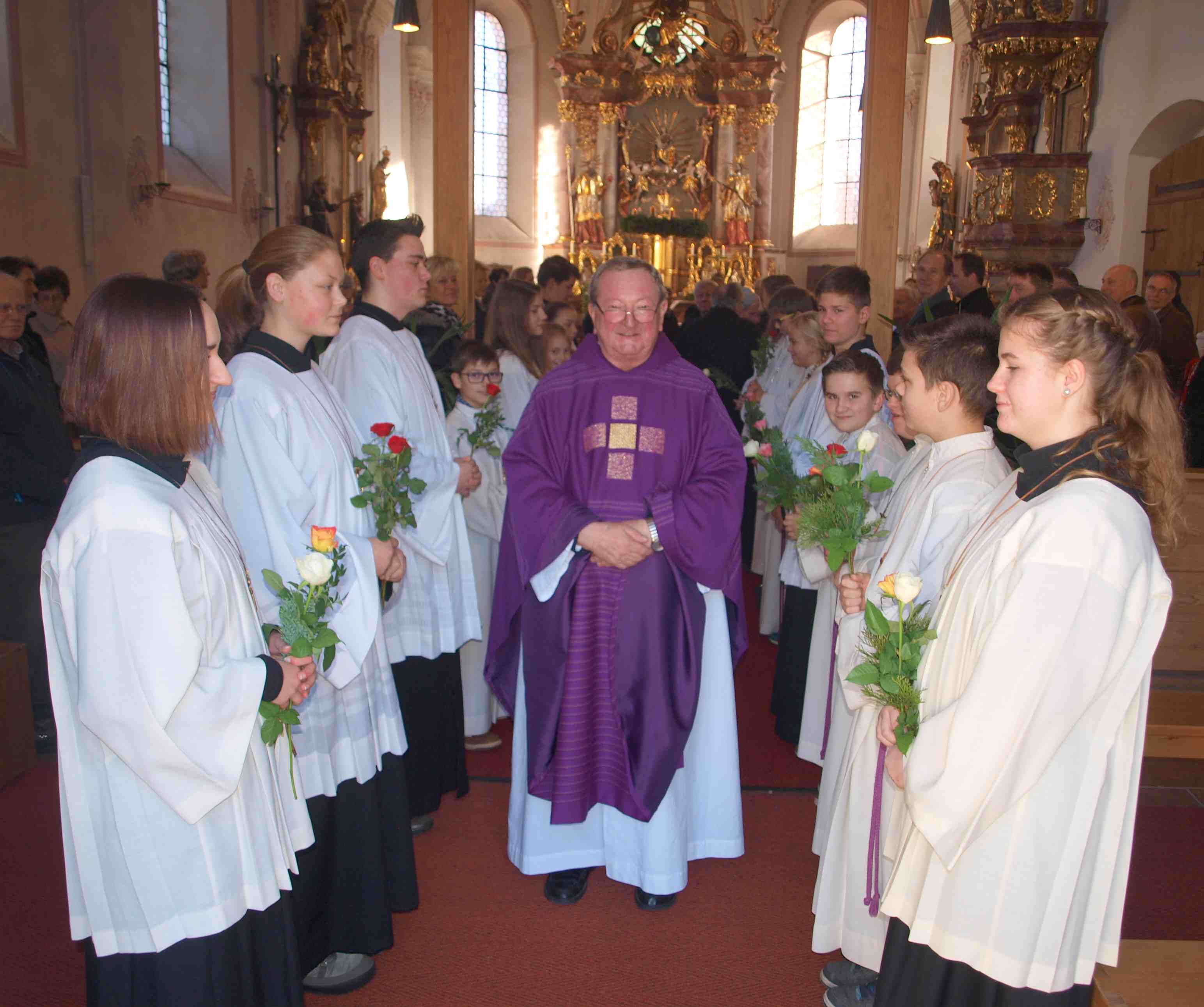 Nach dem feierlichen Schlusssegen bekam Pfr. Josef Koller von den anwesenden Ministrantinnen und Ministranten sowie von seinen Mitarbeiterinnen im Pfarrhaus eine Rose überreicht.