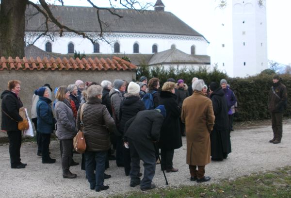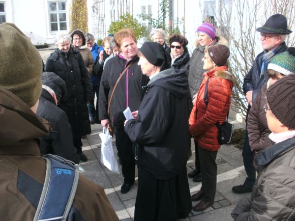 Am Samstag, 20. Februar, wurde der 2. Einkehrtag im Pfarrverband durchgeführt. Dieses Jahr ging es zur Fraueninsel im Chiemsee. Bereits auf der Anfahrt wurde im Bus ein Morgenlob, vorbereitet von Ulrike Traxl, gebetet und gesungen. Nach der Ankunft auf der Fraueninsel wurden die Teilnehmer an der Bootsanlegestelle von Schwester Magdalena begrüßt. Die Ordensfrau verstand es die Gruppe durch ihr immenses Wissen sowohl auf geschichtliches als auch religiöses des Inselmythos aufmerksam zu machen. Die Führung begann an der Karolingischen Torhalle und ging weiter zur Klosterkirche. Die Ausführungen im Kircheninneren des Marienmünsters waren natürlich geprägt durch die Person der Seligen Irmengard, der 1. Äbtissin des Klosters Frauenwörth. Viele Details erfuhren die Teilnehmer beim Besichtigen des Äbtissinenganges im Kloster. Schwester Magdalena verstand es sehr informativ und kurzweilig die Gruppe zu unterhalten. Man hätte noch Stunden zuhören können. Nun ging es zum Mittagessen in die Klosterwirtschaft. Der Nachmittag hatte dann 2 Höhepunkte. Zunächst wurde von Pfr. Christoph Kronast das Fastentuch des Nikolaus v.d. Flüe erklärt, das im 15. Jh. In der Schweiz entstand. Im Mittelpunkt des Meditationsbildes steht Christus, von dem Strahlen ausgehen und Strahlen auf ihn zugehen. Christus, er ist das Haupt, von ihm geht alles aus, auf ihn läuft alles zu. Ringsum weisen Symbole auf „Werke der Barmherzigkeit“ hin. Grundtenor: Amen, ich sage euch: was ihr für den geringsten meiner Brüder getan habt, das habt ihr mir getan. Mit einem Gebet beendete Pfr. Christoph Kronast diese meditative Stunde. Ein Gottesdienst in der Klosterkirche bildete den Abschluss eines religiös und spirituell geprägten Tages. Man könnte sich vorstellen, dass so ein Tag zu einem festen Bestand im Jahreskreis werden könnte.