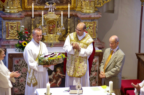 In der geschichtsträchtigen Filialkirche am Johannishögl wurde am Samstagabend ein feierlicher Patroziniumgottesdienst gefeiert. Im Zuge dieser Messe hat sich auch die Pfarrei Piding offiziell von Diakon Horst Seipel verabschiedet. Er hat drei Jahre lange im Pfarrverband Anger-Aufham-Piding gewirkt und tritt ab Juli eine neue Stelle im Pfarrverband Halfing am Chiemsee an. Für eine festliche würdige Gestaltung der Abendmesse sorgte der Pidinger Kirchenchor unter der Leitung von Anni Utz gemeinsam mit den Pidinger Kirchenbläsern.