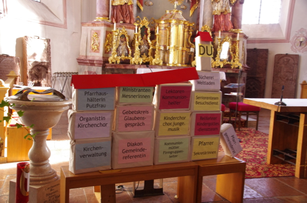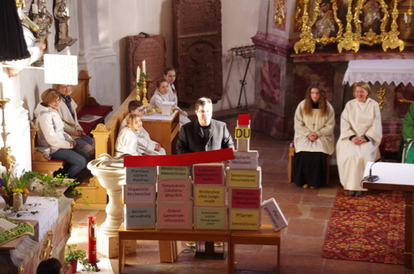 Die Ministranten hatten in ihrer letzten Gruppenstunde Bausteine aus Pappkartons gebastelt, die zusammen ganz anschaulich die bunte, lebende Kirche ergaben: Alle Gruppen und Dienste der Pfarrei waren hier vertreten, Haupt- und Ehrenamtliche bunt gemischt und im Kirchturm jeder Einzelne aus der Pfarrgemeinde.