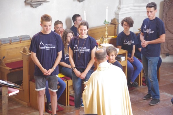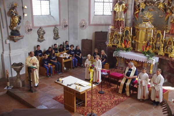 Während des Gottesdienstes wurden einige teilweise langjährige Ministranten verabschiedet: Oberministrant Thomas Kruck und Pfarrer Anghel bedankten sich bei Katharina Koch, Maria Popp, Thomas Sedlmeier und Raphael Wind für den teilweise jahrelangen Dienst in der Kirche mit einem kleinen Präsent. Dann folgte die Aufnahme der neuen Ministranten: Ab heute treten Lukas Geiger, Sarah Kuhn, Jonas Krutzler und Alexandra Menges ihren Ministrantendienst an. Ältere Ministranten kleideten sie ein und halfen ihnen, ihre Alben überzuziehen. Außerdem bekamen sie ihre Ministrantenkreuze überreicht und sind damit offiziell aufgenommen in die Schar der Pidinger Ministranten.