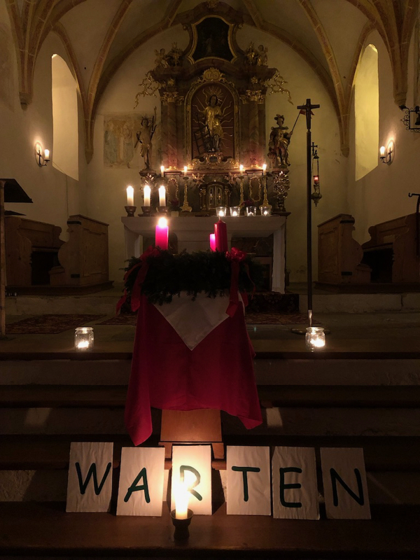 Am Beginn der Andacht stand ein „Akrostichon“ – ein Gedicht oder Text, bei dem die Wortanfänge hintereinander gelesen einen eigenen Sinn ergeben. „Warten“ war alsbald in großen Buchstaben auf den Altarstufen zu lesen, gebildet aus folgenden Impulsen: Was wird kommen?, Aufmerksam werden, Ruhe finden, Türen öffnen, Entdecken und Neugierig sein.