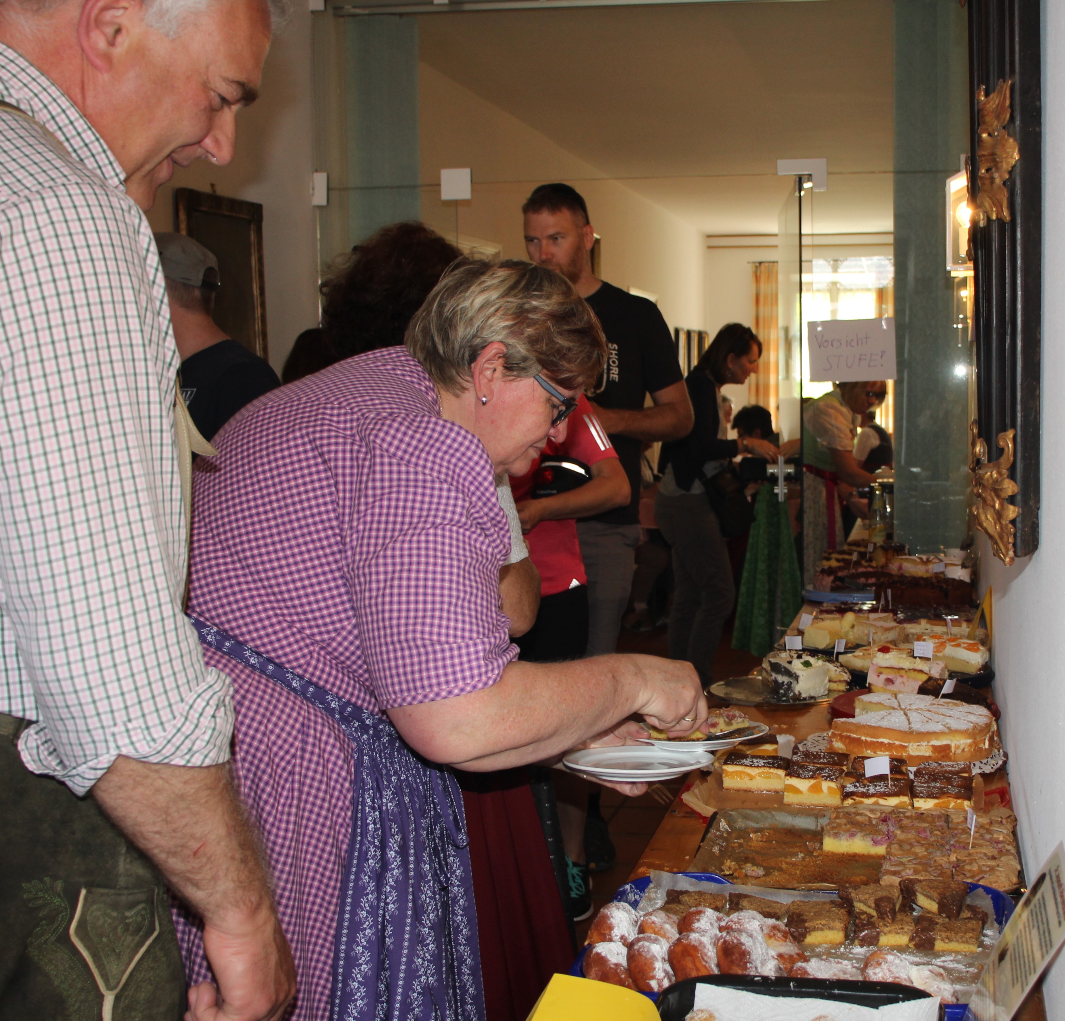 In Dirndl bedienten Helferinnen des Eine-Welt-Kreises jeden Gast persönlich und packten auch Kuchen zum Mitheimnehmen ein, während andere Kolleginnen in der Küche unermüdlich spülten, Kaffee kochten und neu angelieferte Kuchen in Stücke schnitten. Manche Besucherinnen und Besucher genossen die Kühle im breiten, historischen Pfarrhofflur und andere die Wärme an den Biertischen im Freien, teils im idyllischen Pfarrgarten unter den Bäumen.