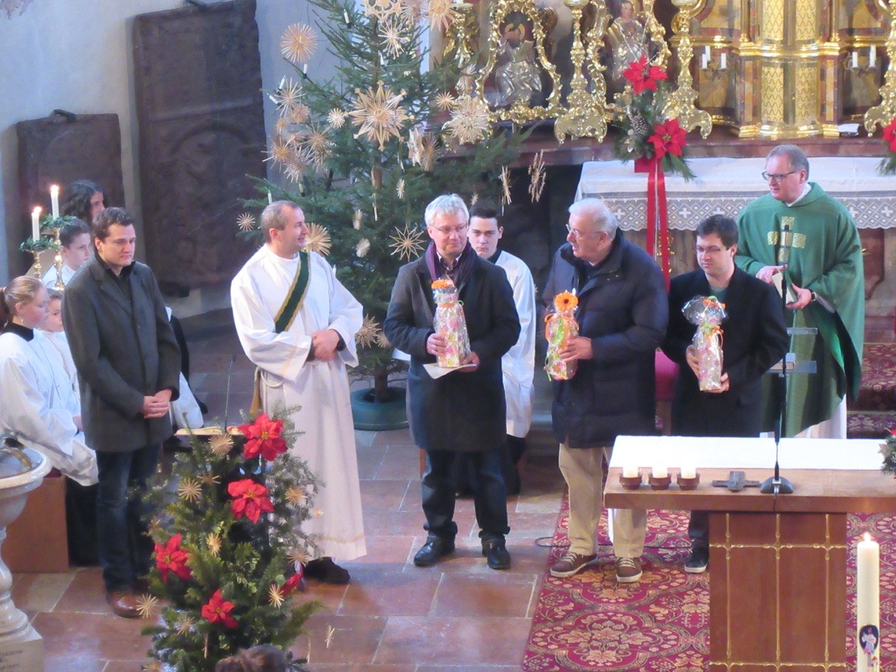 Das Bild zeigt von rechts nach links den Zelebranten des Gottesdienstes, Dekan Msgr. Dr. Thomas Frauenlob, Karl Wimberger, Rudolf Salzeder, Thomas Friebel, Diakon Horst Seipel und Peter Kleinert.