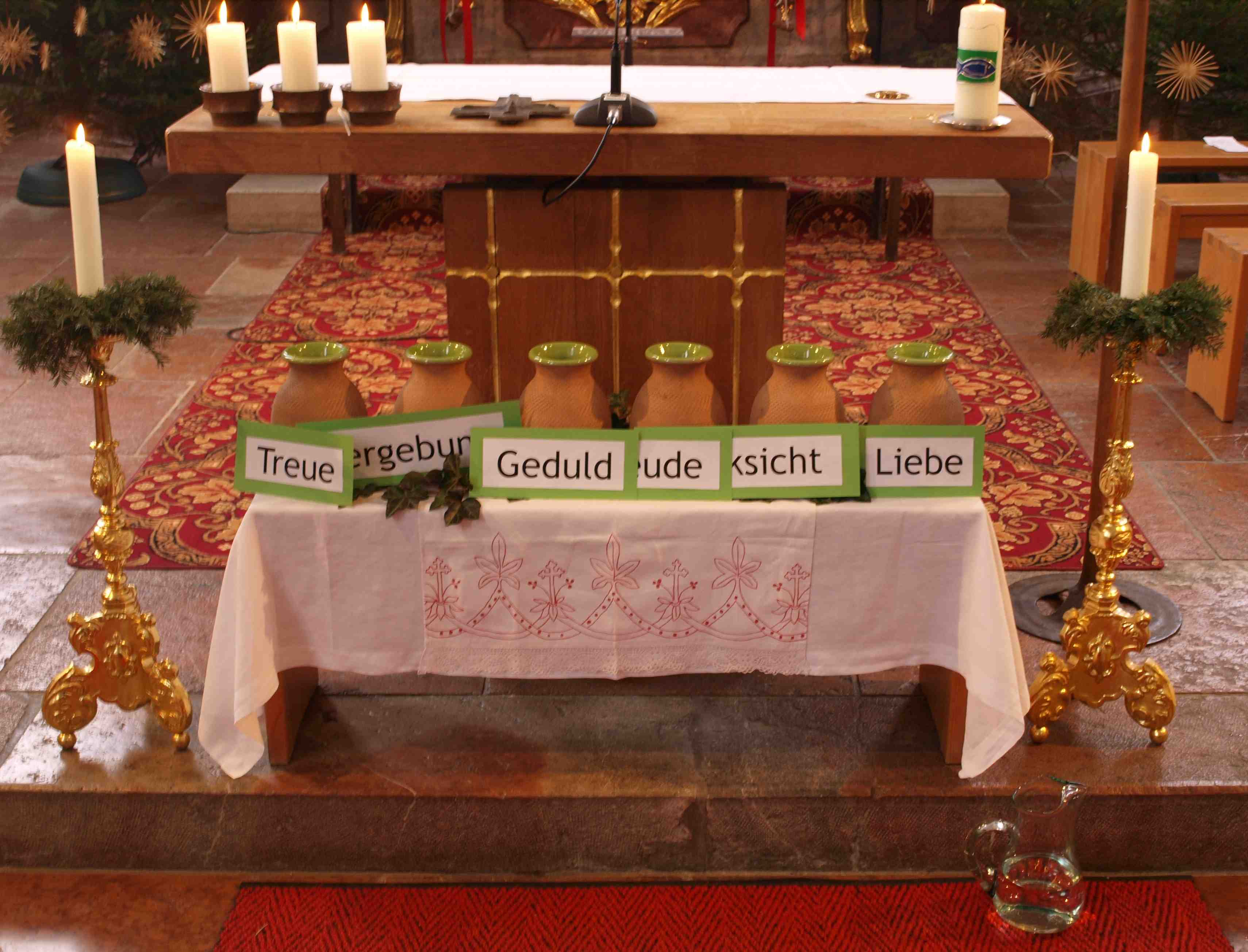 Wir können das Geschehen nachvollziehen, auch wir feiern Feste in unserer Familie. In Anlehnung an die Worte aus dem Johannesevangelium in dem die Diener die Krüge mit Wasser füllten, füllten auch die Kinder 6 Krüge mit Wasser auf. Gleichzeitig wurden symbolisch Liebe, Rücksicht, Freude, Geduld, Vergebung und Treue mit eingegossen.