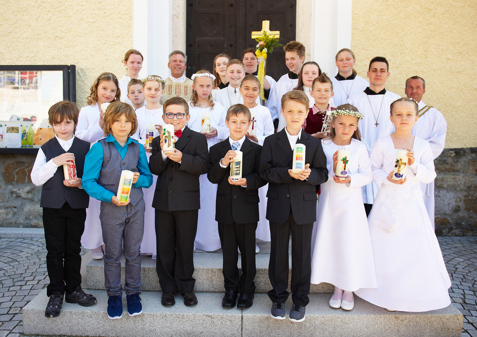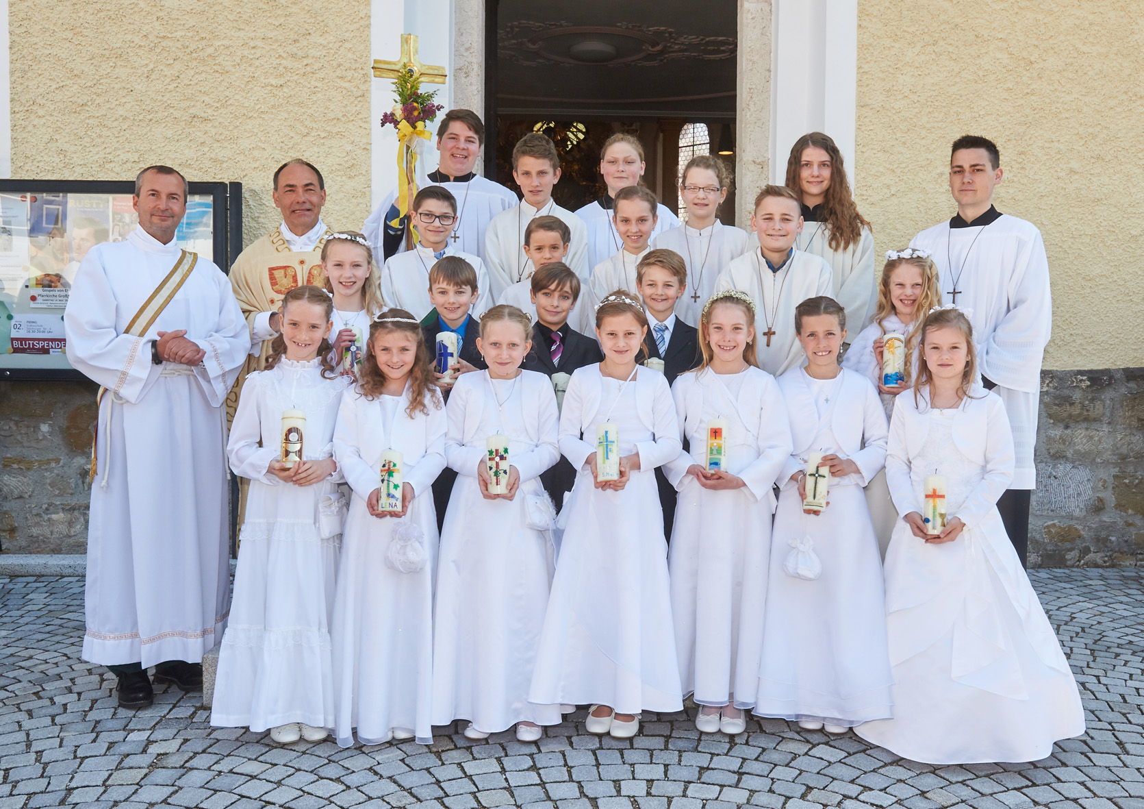 Vom Pfarrheim zogen die Kinder in die festlich geschmückte Pfarrkirche. Zelebriert wurden die Messfeiern von Pfarrer Helmut Bauer und Pfarrer Mathias Häusl. Beide Gottesdienste wurden vom Kirchenchor, unter der Leitung von Anni Utz, feierlich begleitet. Die Kommunionkinder trugen in den Kyrie-Rufen, bei den Fürbitten und bei der Gabenbereitung zur lebendigen Gestaltung des Gottesdienstes bei.