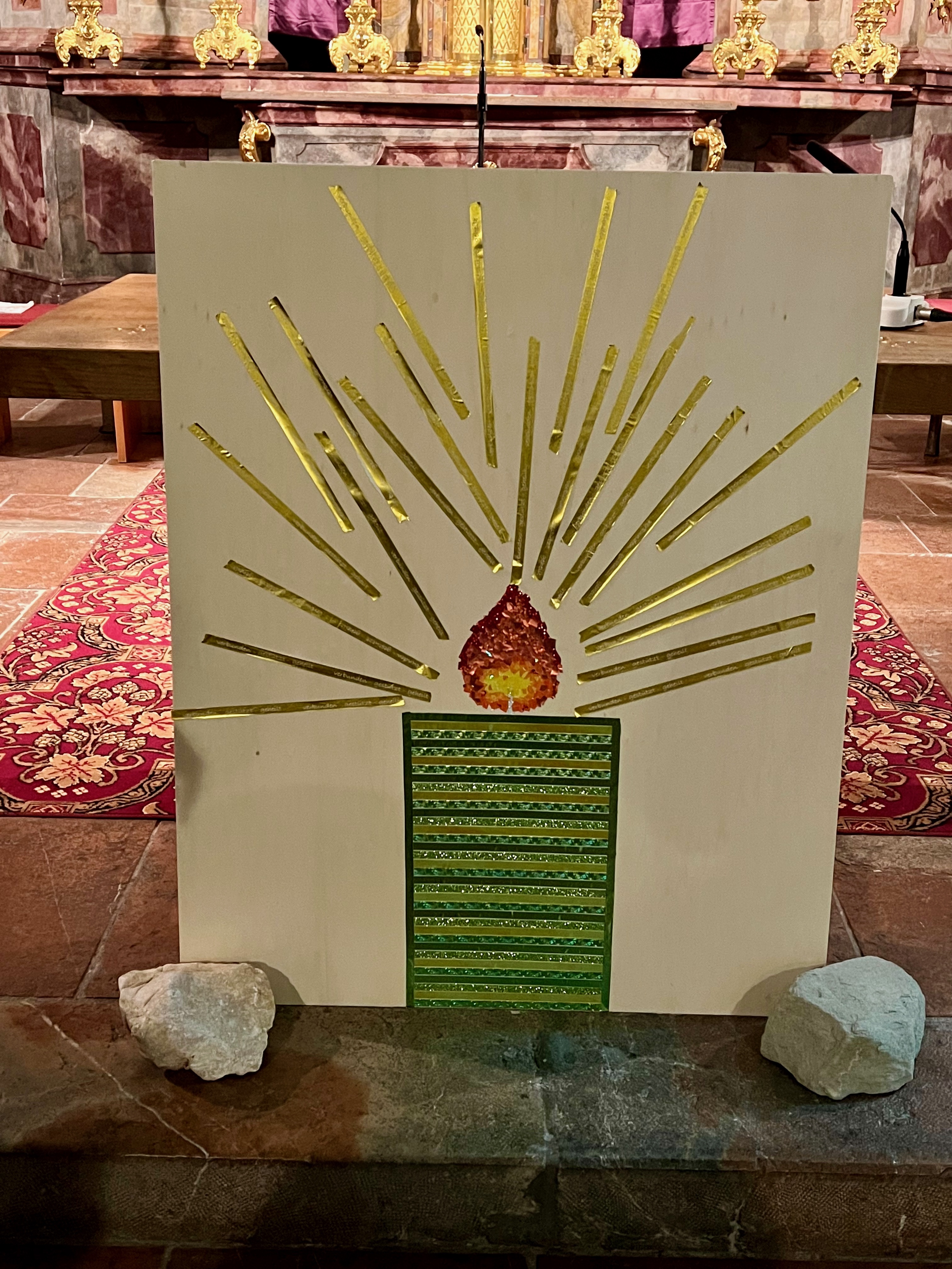 Das zentrale Bild am Altar, eine brennende Kerze, hatten die Ministranten mit sogenannten „Tapes“ gestaltet. Tape Art ist eine Kunstform, bei der großflächige Bilder mit einzelnen Klebebandstreifen gestaltet werden. Viele kleine Einzelteile ergeben ein großes Ganzes, Tapes verbinden Einzelteile, Bruchstücke.